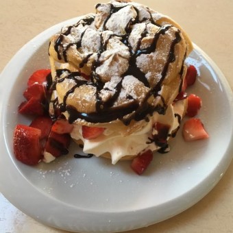 - ein Apfelgedicht mit knuspriger Waffel, hausgemachter Apfelstrudelmasse, hausgemachtem Vanilleeis, Vanillesoße und Sahne