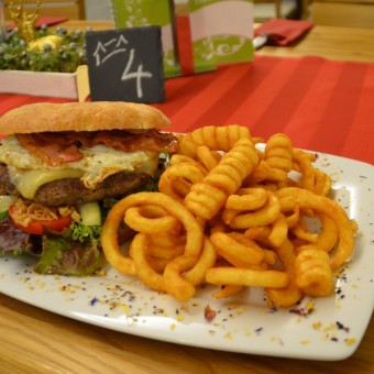 Burger Sauce / Salat / Gurke / Tomate / rote Zwiebeln / saftiges Beef mit Käse überbacken / Bacon / Spiegelei / Barbecue Sauce