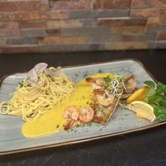 gebratenes Zander und Lachsfilet / fruchtige Orangensauce / frische Tagliarinis