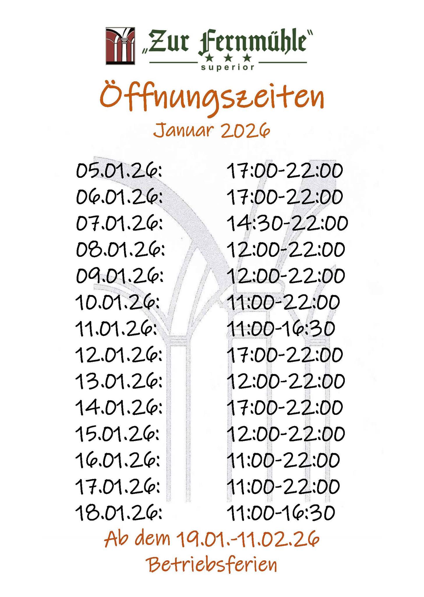 Wenn Sie noch Genaueres über uns wissen möchten, empfehlen wir Ihnen die Broschüre „Die Geschichte der Fernmühle“, in der auf humorvolle Art und Weise einige Anekdoten während unserer nunmehr fast 15-jährigen Geschichte beschrieben sind. Fragen Sie einfach unsere Mitarbeiter!